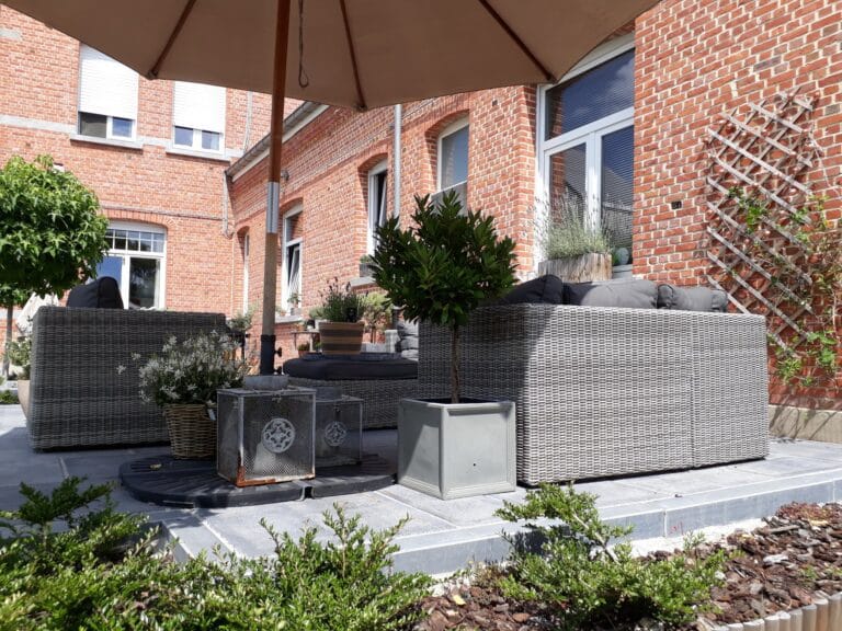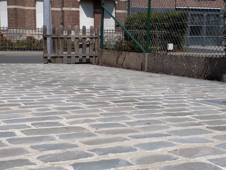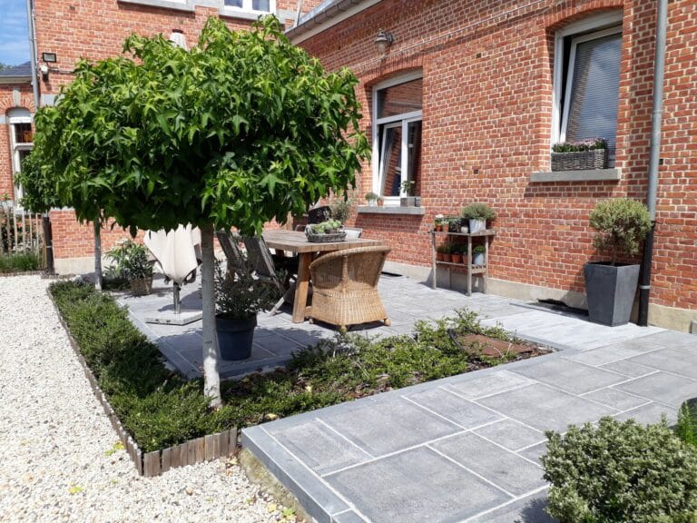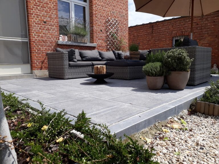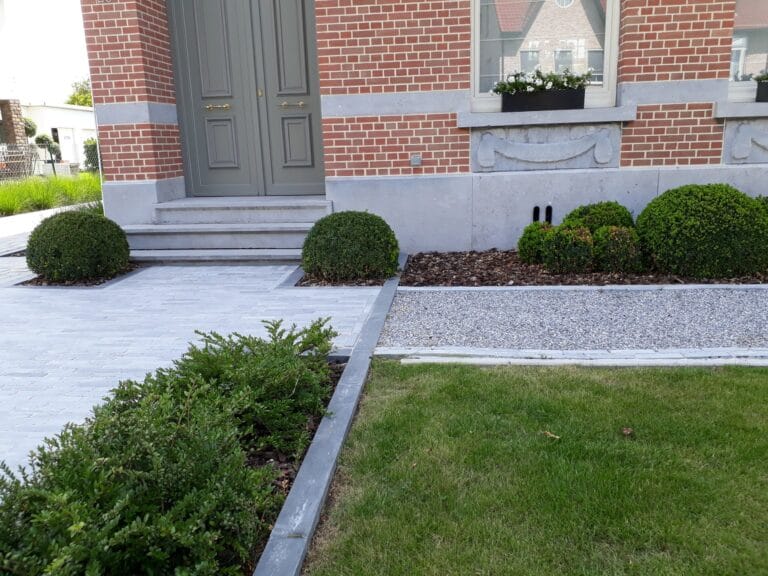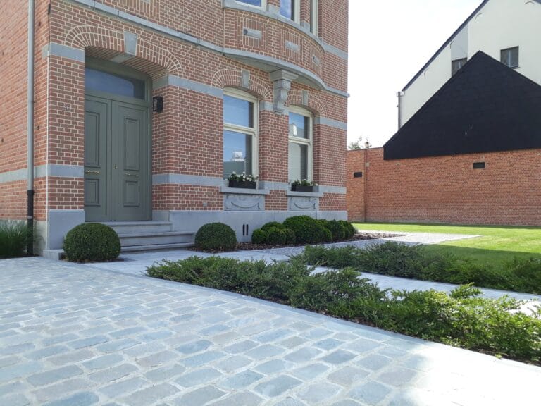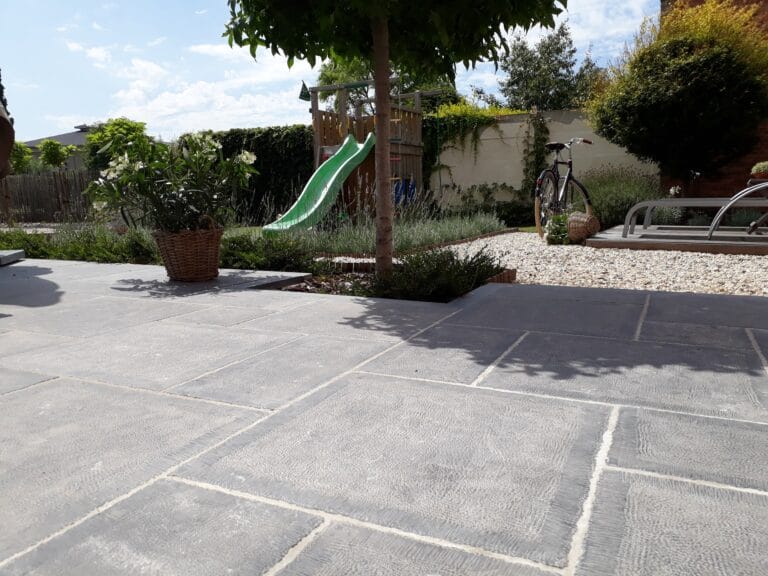 Gezaagde kassei oprit + paden en terras in blauwe natuursteen