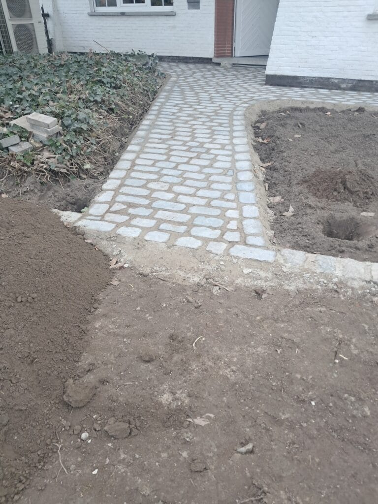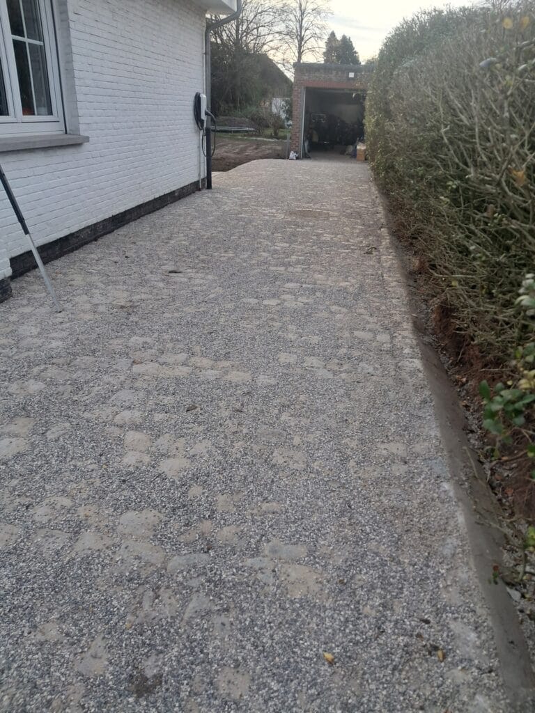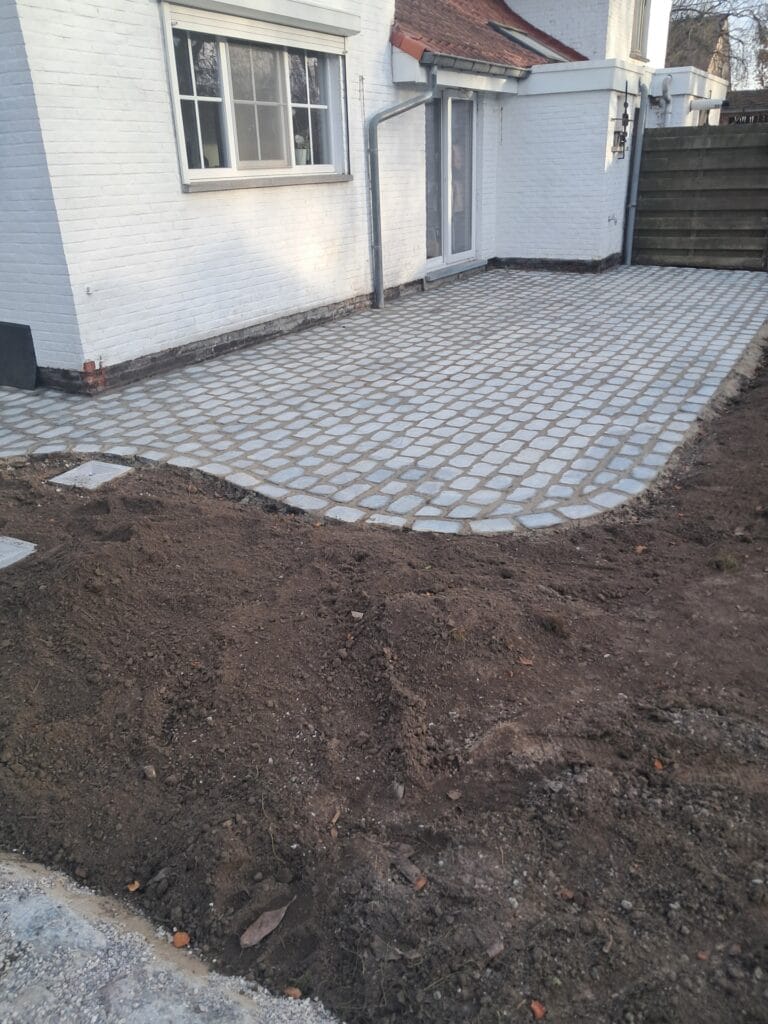 Pad en terras in gezaagde kassei + oprit in waterdoorlatende kassei