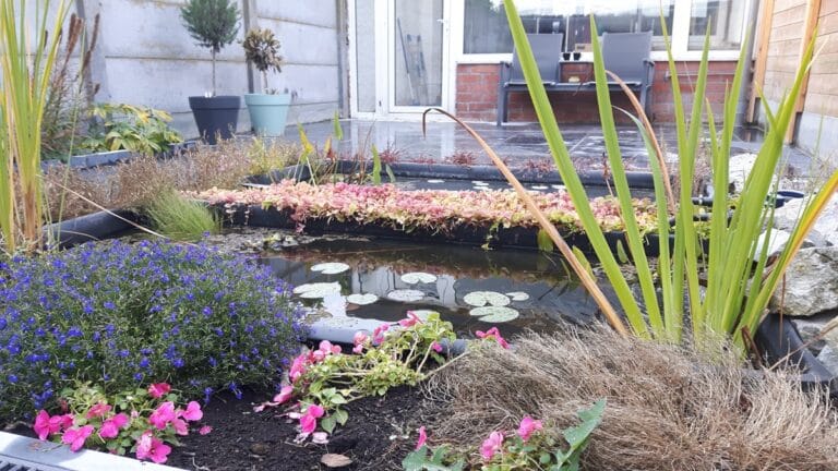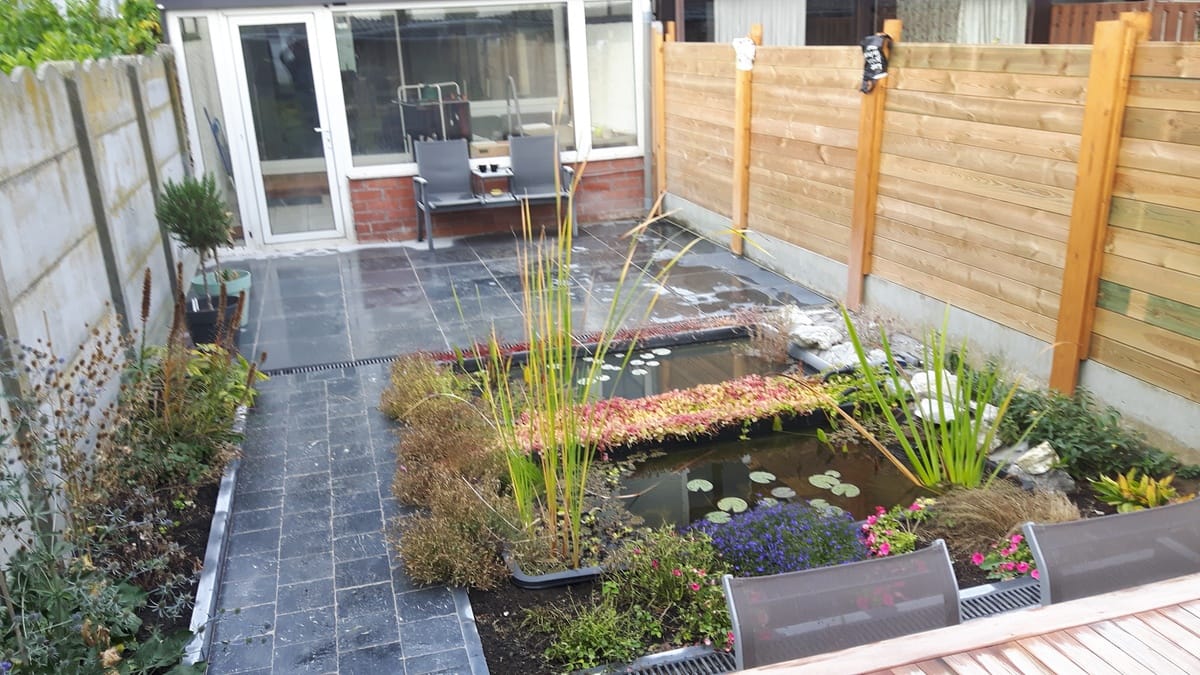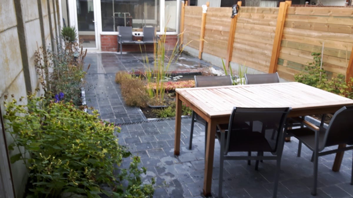 Stadstuintje in natuursteen met vijverpartij